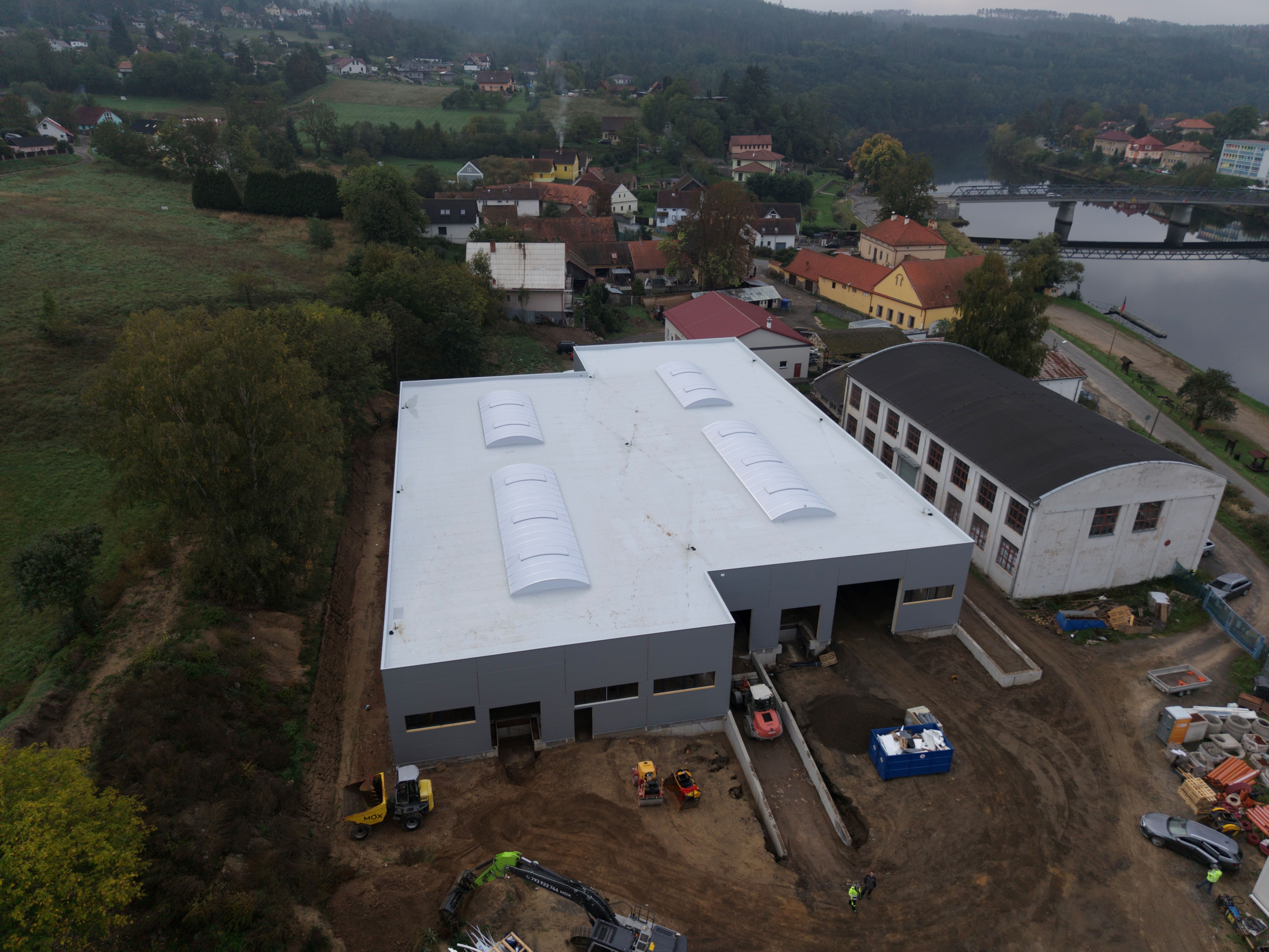 V současné době pracujeme na další zajímavé realizaci – přístavbě výrobní a administrativní části haly o celkové ploše přes 5 100 m². Skladba střešního pláště: parozábrana z PE fólie tl. 0,2 mm, 2 vrstvy minerální izolace o celkové tl. 260 mm, hydroizolační mPVC fólie tl. 1,5 mm.